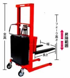 | ■仕様 ・昇降方式:バッテリー油圧式(タービン油:ISO-VG32使用) ・前車輪:固定ウレタン車2個 ・後車輪:自在ゴム車輪ブレーキ付2個 ・モータ:DC12V、0.7kW ■材質 ・本体:スチール