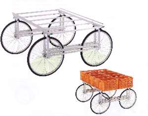 SAW-1は、標準的なコンテナを最大10個搭載可能な万能作業台車です。 荷台高さを、最低750ミリから最大1050ミリまで無階段に調整できるのをはじめ、荷台ガード、車輪間隔も無階段調整を可能にし、多彩な用途に対応します。 農作業での過酷な作業に対応して、荷台部には40×20ミリを、車輪部には30×30ミリの強な角パイプを使用。荷台部と車輪部はスクリューネジで簡単に分解・組立ができ、コンパクトに収納できます。 |