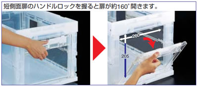 ●フタをしても積み重ねが可能です。 ●ロックの操作で長側面扉の半開、全開で使分けが可能です。 ●商品のディスプレイ、収納、整理など多目的に利用できます。 ●積み重ねた時でも外から収納物の確認ができるうえ、下の段からでもそのまま収納物を取り出せませす。 ●ワンタッチロック式扉、短側1面・長側1面付 ※左写真の奥2面は扉無しです。 |