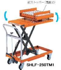 | <特長> ●フット油圧式 ●ターンテーブル付(360度回転・45度毎ストッパー) ●ローラーコンベアー付(φ38.1×P55) <仕様> ●昇降方式:足踏式油圧ポンプ ●キャスター:各機種別に設定 |
