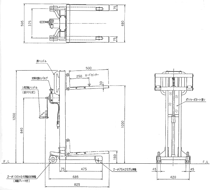 | リフター SKLシリーズ/品番 SKL-G100-10F-A 三面図 (詳細図) | |