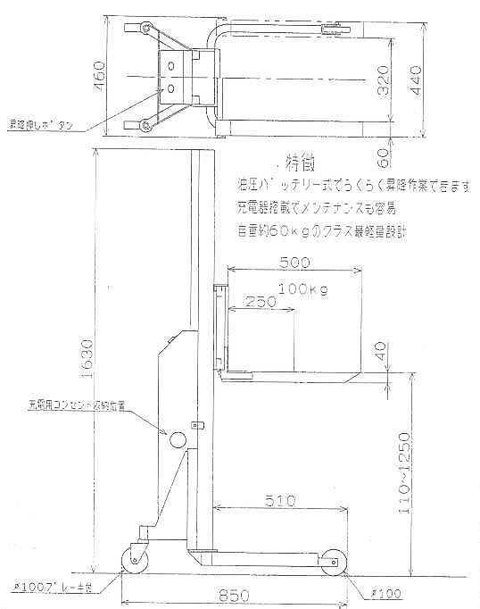 | 電動リフター/品番 MB17LM-100K 三面図 (詳細図) | |