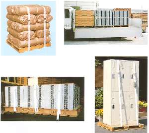 ●帯鉄、木箱梱包なしでOKです。 ●幅広ベルトでキズを付けません。 ●梱包作業をスピーディーにこなせます。 ●二度締めもできます。 ●木枠フィルム等の廃材処理がありません。 使用方法のページへ |