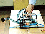 PPバンド用の熱溶着機です。 引締めは手動、溶着と切断は自動で行います。 |