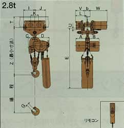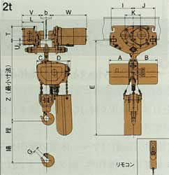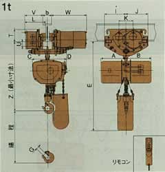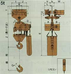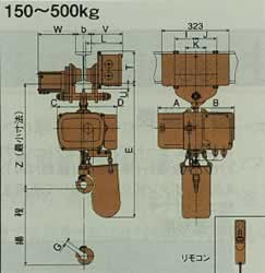 1.巻上速度、横行速度の( )内はm/min換算値を示します。 2. Z・E・T・U・寸法は適用ビーム幅のうち最大ビーム幅の場合を示しています。 ビーム厚みにより若干変わりますのでご留意下さい。 3.高揚程記号Hの付いた機種の質量は揚程6mの場合を示します。 揚程が変わると質量が異なりますのでお問い合わせ下さい。 4.適用ビーム幅の■■■は出荷時の大きさを示します。 5.巻上部は単独で懸垂型、手押しトロリ付、鎖動トロリ付としてご利用可能です。 6.懸垂型、手押しトロリ付、鎖動トロリ付の仕様、外形寸法は、押しボタン操作式と同一です。 7.150kg・2〜5tは注文生産品です。