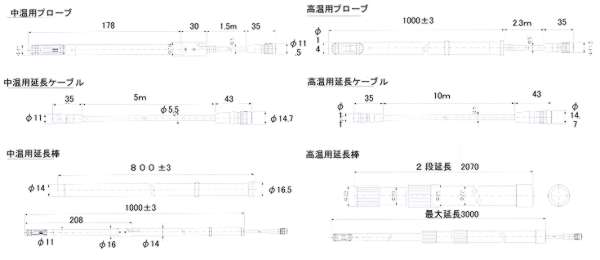 高温用は500℃までの風温計測、中温用は200℃までの風温を計測、風速50m/sを計測します。プローブ及びプローブボードの交換だけで中温・高温の変更ができます。 ※写真のプローブ、高温用延長棒は別売りとなります ▲アナログ出力 ▲RS232C ▲メモリ機能 ▲演算機能 ▲風量測定 ▲プローブ互換 ▲乾電池, ▲AC電源 |