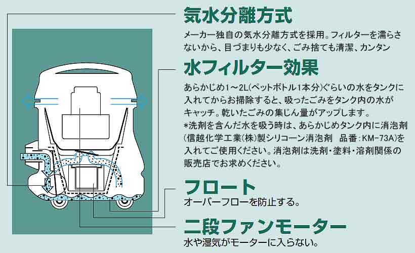 | 一般店舗やご家庭でも使えるコンパクトでかわいいデザイン ごみと水をいっしょに吸い込める便利な設計です。 普通の床と汚れたフロア等で使い分けができる2個の床用吸口付き 広い範囲の清掃を配慮した10mコード ごみ捨てサイン、コードフック付き ![]() ■特徴 ●フィルターを濡らさない気水分離方式をはじめ、使いやすさを追求した設計です ![]() ●分解ザブ洗い設計 お手入れがラクなように、フィルター部を簡単に取り出せる設計にしました。ごみ捨て・排水はもちろん、付着した汚れも水洗いできます。 ![]() ●10mコード お店のすみずみまでお掃除できるよう、10mコードを付けました。店内はもちろん、入口からお店の前までお掃除の範囲が広がります。 ■用途 レストラン、生花店、青果店、鮮魚店、精米店、コンビニエンスストア、食堂、スポーツ用品店、ショールーム、モデルハウス、など。 ■仕様