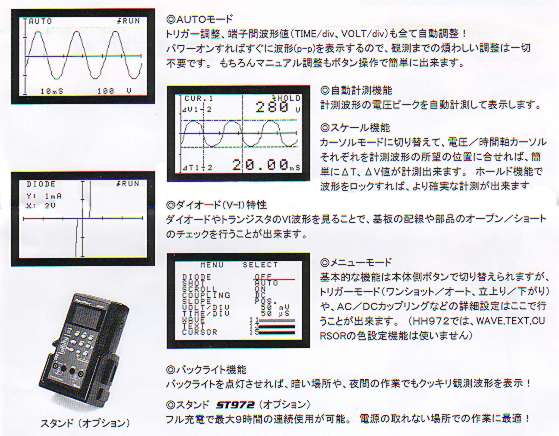 ポケットにも入る、小型サイズ 周波数帯域5MHz 垂直(縦)軸レンジ 50mV/div〜200V/div 測定値ホールド機能 オートパワーオフ機能 ダイオード特性測定可能 暗くても安心、液晶表示バックライト付 オートレンジ付で簡単操作。 |