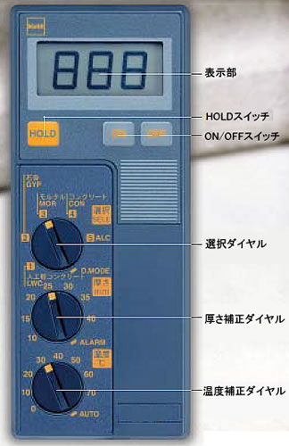 | ■特長 ●小型・軽量のハンディタイプです。 操作は測定対象に本器を軽く押し当てるだけなので、現場を選ばずいつでも簡単に測定できます。 ●ダイヤル一つで各種材料の測定が可能です。 測定対象の選択はダイヤルで人口軽量骨材コンクリート、石膏ボード、モルタル、コンクリート、ALCにセットするだけです。 ●各種機能を装備しています。 設定値以上の水分を検出するとブザーで知らせるアラーム機能や、測定値をそのまま表示し続けるホールド機能付きです。 ●温度補正機能と厚さ補正機能もダイヤル一つです。 温度補正は自動補正と、ダイヤル設定による手動補正が可能。さらに、より正確な測定のための厚さ補正ダイヤルも装備。 ●D.MODEを使えば特殊な材料の水分測定もできます。 材量の水分とD.MODE目盛の関係式を求めることによって、上記5種類以外の材料の水分測定も可能です。 ■操作パネル(画像クリックで拡大します。) ![]() ■仕様