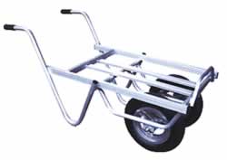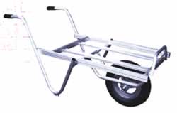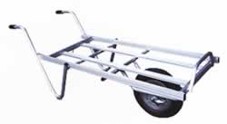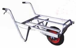 オールアルミ製・溶接仕上げで、軽くて丈夫! タイヤのホイールまでアルミを使用しております。 (段付き、ブレーキ付き一輪車はスチール製タイヤを使用) |