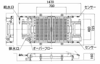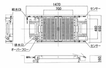 | ■特長 自動靴底洗浄機(オートマット)の水中靴底洗浄方式と前後左右に水平回転するローリングブラシの特長に毛細管 現象を応用し、台車が通過するたびに車輪の接地面に付着した汚れを洗浄します。 ![]() ■外観図 (mm)