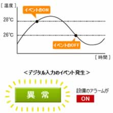 | ■特長 ●温度・湿度・圧力・流量などの各種センサーや電力量計などの情報を無線で伝送し、一元管理できる監視・制御装 置です。 ●既存の設備にも大規模な工事をせずにお使い頂けます。 ●通信費不要。(メール送信にはインターネットにつながる環境が必要です) ■基本構成 ![]() ■子機 ①シリアル通信用ポートRS-232C/RS-485選択1点 ※受信機専用です。 ②すぐに使える出力ポートを標準搭載。デジタルポート:4点(無電圧a接点/NPNオープンコレクタ) ③アナログ入力ポート:4点 (4-20mA/1-5V) ![]() ■柔軟で広範なネットワーク ●親機1台に対して子機が256台まで接続できます。 ●親機⇔子機、及び子機⇔子機間の通信到達距離は見通し800~1000m。 ●子機には中継機能が内蔵されているので、最大で10段までの中継ができます。 更に中継点の通信に障害があれば自動的に他の中継ルートに変更します。 ![]() ■遠方から 監視・記録+手動操作+自動制御 ができる ●点在する子機のデータを1ヶ所で集中監視・記録ができます。 ●パソコンから、指定した子機の出力を入-切できます。 ●各子機毎に、アナログ入力やデジタル入力の情報に連動させてリレー出力を入-切するような制御ができます。 ■モニタ画面 ①見たいデータのみの単独常時もできます。 ②子機から親機へのデータ送信は、30秒、60秒、90秒、120秒毎の定期送信の他に、アナログ入力のイベント発生時 及びデジタル入力のタイミングでも行います。 ③パソコンの画面からデータを見て子機の出力端子を手動で入-切操作ができる。 ![]() ■CSV形式でのデータ記録 ●CSVファイルは子機毎/一括、日別/週別/月別などに分けて保存する設定が出来ます。 ![]() ●表計算ソフトを利用してグラフ化が可能 ![]() ■自動制御(例) 動作値(上)復帰値(下)を設定