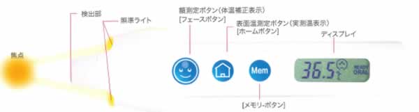 | ■特長 ●簡単 フェースボタンを押すと照準ランプが点灯します。 額の中央で二つの丸い光線が一点になるまで合わせます。 ボタンを離すと、ディスプレーに測定結果が表示されます。 ●正確 誤差わずか±0.2℃ ●スピーディー わずか3秒測定 ●LED 目に安全なLEDを使用 ●清潔 非接触型のため清潔 ■動作原理 表面温度測定は、人体表面から出ている5〜14μmの赤外線を検出部でとらえ、また内蔵サーミスターで室温を測定し、その2つのデータから体表面温度に変換し表示します。 体温補正表示は、額の表面をもとに内蔵されているデータテーブルを用い変換補正を行い表示します。 ■皮膚赤外線体温計を使うと待つ必要がなく即測定可能 緊急時、パンデミック時、又は直ぐ測定する必要がある時に、本器で周辺温度を体温計に自動セットするだけで即座に使用できます。 皮膚赤外線体温計は周辺温度と同じ温度になるまで待つ必要はありません。 ■メモリー機能 皮膚赤外線体温計は、9個の測定値を保存できます。 なた、”メモリーボタン”を押すだけで簡単にメモリーを呼び出せます。 ■自動的に電源をオフ 皮膚赤外線体温計は、電源のオフが設定できます。 使用後に電源をオフにするか、或いは使用後約4時間で電源をオフにするかを設定でき、電源を節約します。 ■3種の体温設定が可能 腋窩温(日本の標準測定法)、舌下温(世界の標準測定法)、直腸温(深部体温に最も近い温度)の中で測定したい予測モードを簡単に設定できます。 額は体温変化を測定するのに理想的な測定部位です。 ■アジアの空港での使用 非接触型のため、インフルエンザ、麻疹、MRSAなどの感染症の際に汚染の危険を少くします。 SARS流行時には多くの国で使用されました。 ■各部名称 ![]() ■仕様