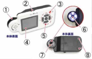 | ■機能詳細 ●グレースケールモード(白黒) 画像を白黒で表示し、カラーで分かりづらい画像を白黒 で写します。 ●エンボスモード 画像を立体的に表示することが可能です ●比較モード 撮影した画像と現在の画像を比較しながら見れます。 ●分割倍率比較モード 7 倍と25 倍、27 倍と108 倍の倍率比較が可能です。 ■各部名称 ![]()