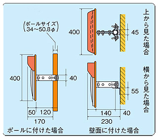 ■特長 ●鏡材質/アクリル ●壁・ポール用取付金具付き ![]() ●フード付き ●軽くて、われにくい ●ポール有効径:34.0φ~50.8φまでOK ■取り付け例 ※ポールは別売りです ![]() ■取り付け図・構造図(M1082-40KS) ![]() ■仕様