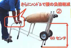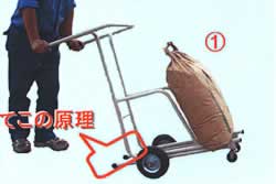 使い方は単純!簡単! ①大径タイヤと自在キャスターで楽々運搬! ②「てこの原理」でハンドルを押し下げる ③60cmの高さまで米袋が上がります。腰の負担が軽減できます |