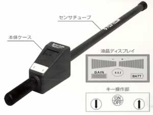| ■特長 ●極性(N極-側・S極+側)の判別ができるので、埋没している金属物体の大きさ、絶縁管路のスパンの探測が可能です。 ●センターチューブは、防水機構で水中でも探知できます。 (本体操作部は防水ではありません) ●パネルメータ(LCD表示・液晶ディスプレイ・バーグラフ)で確認できます。 ●センサを上下に内蔵し、垂直な埋没物体に効果的です。