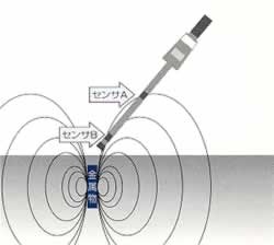 ■用途 ●垂直に埋没した境界マーカー、金属杭、制水弁等の探知 ●水平に埋没した消火栓、ボックス、マンホール等の探査。 ●工事現場で埋没・水没し不明となった鉄材・工具類の発見に。 ●積雪下の金属物 ●水中の金属物 ●捨てられ埋没した凶器(銃・刀)類の捜索に。 ※注意:金・銀・銅・アルミニウム・ステンレス等磁化されない金属は探知できません。 ■原理 下図のように磁界に本器を接近させると、センサAよりセンサBの方に磁界が強く当たります。 その結果、センサA、B間の磁界バランスがくずれ、このくずれを音で捉え、物体の位置を探知します。 また、本器の構造は上下にセンサを内臓しているため、水平物体より垂直に埋没した物体の探知に、より効果を発揮します。 ![]() ■構成 ![]() ■仕様