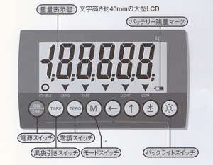 | 手元表示器 ●操作スイッチ 「電源」、「零調」、「風袋引き」 ●表示 「重量値文字高さ約25mmLCD」、「センタ零」、「風袋 引き 」、「バッテリー残量」 ●その他 電源:簡易金具により、卓上、壁掛け可能 アルカリ単3乾電池4個 使用可能時間約100時間以上 寸法:W136mm×H95mm×D37mm 質量約390g 共通仕様 使用温度条件:-5〜40℃ 防水仕様ではございません。 雨天時にご使用の場合は別途ご相談願います。 標準付属品:バッテリー、充電器、置き台、取扱説明書