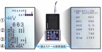 ハンディ硬さ計は従来の硬さ試験機とは全く異なり、測定物にできた圧痕の大きさを顕微鏡で測定する代わりに、ダイヤモンド圧子付振動棒を定荷重で材料面に押しつけ、超音波の縦振動を与えて硬さを測定する計測器です。![]() ■特長 ●プローブの小型化(メーカー比)により狭所の測定可能。 ●測定回数100万回以上の耐久性。 ●測定時間はわずか2秒。 ●ビッカース圧子を使用した静圧荷重式。 ●約0.1mmの微小圧痕。 ●測定台の材質・質量影響なし。 ●上下左右方向から測定可能。 ●静圧荷重式で圧子の定期交換不要。 ●上下限アラーム値の設定可能。 ■同一材質、同一荷重で、被測定面に振動棒を押し当てると軟らかい被測定物は、圧痕が深くなり拘束力が強くなります。そのため共振周波数は高くなります。 逆に硬い被測定物は拘束力が弱くなり、共振周波数は低くなります。 その変化量と方さとの相関を取り、硬さ換算します。 ![]() ■表示・機能 ①硬さスケールは、HV,HRC,HRB,HS,HBWのいずれかを表示 ②統計計算機能、最大・最小・平均・標準偏差を表示 ③統計処理のための測定回数設定値を表示 ④校正値の係数表示(鋼は、約1,000) ![]() ■タイプ ![]() ■ギア計測例 ![]() ![]() ![]() ![]() ■クランクシャフト計測例 ![]() ![]() ■カムシャフトの端面部計測例 ![]() ![]() ■共通仕様