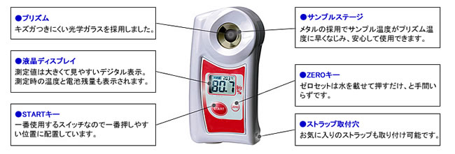 | ■特長 ●人間工学に基づいた斬新なデザインは使いやすい 人間工学に基づき、「使いやすさ」「わかりやすさ」を追求しました。衛生面では溝部分を減らし、さらに「丸洗い設計」を採用しました。 屋外などの強い外光での誤測定を防止する「外光誤測定防止機能(ELI機能)」を搭載しました。 ●器械全体を水で丸洗いできる衛生設計 ●サンプルがこぼれにくく拭き取りやすい造形美 ●低温から高温サンプルまで対応可能 ●自動温度補正機能付 ●屋外での測定も安心のELI機能付 ●机上でも安定した測定が可能なデザイン ●誤って水に落としても「浮く」機能を搭載 ■機能 ![]() ■仕様