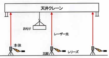 | ■クレーン検査でのレーザー距離計の有効性、または使用例等について 1.クレーンのたわみ測定 測定は地上より行います。下図のように機器を設置しレリーズのスイッチで距離測定を行います。 短時間に1人で正確な測定が可能です、また測定者間のバラツキもなくなります。 ![]() 付属の水準器で本器を真上に向けている。3箇所を測定する場合の参考です。 2.クレーンレール間(スパン)の測定 レール間スパンの測定は下図の方法が測定精度においおて最適です。 ![]() 角度調整機能付きジグ (レール側面を測定する場合、レーザー光を当てるのが困難になるため角度調整機能が必要) このようにレーザー距離計を用いることにより測定効率性、測定精度、安全性の面で格段に向上することが言えます。 3.車載クレーンでのブーム先端位置測定 角度計付レーザー距離計を使用するとブーム先端位置の高さ・水平距離が常時測定可能です。 ![]() 4.その他 ●クレーン建設作業における建設限界に利用 ●クレーンの移動における衝突防止に利用 |