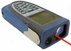 | ■メリット ●省力化:操作は簡単で、2人の作業が1人で行えます。 ●安全性:人が行けない危険な場所、スペースのない場所の測定を効率良く行えます。 ●正確性:誰でも同じ±1.5mmの精度で測定できます。 ●利便性:ハンディタイプで、小型・軽量で持ち運びが簡単です。また、カメラ三脚に取付ての測定も可能です。 ●データ収集性:ユニット搭載の本体からユニット機能付きのパソコン、PDAなどにデータを送信できます。 ●高機能性:直線距離を測定するだけでなく、測定モード(加算、減算、面積、容積計算、連続測定、ピタゴラス機能) があります。特にピタゴラス機能は、離れた場所から2点間(高さ、幅)の距離測定が可能で非常に便利です。 ●省エネ性:単3形乾電池×2本で動作します。(約10,000回測定) ■アプリケーション