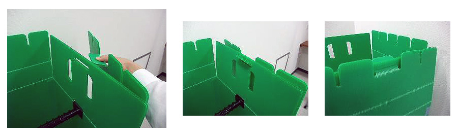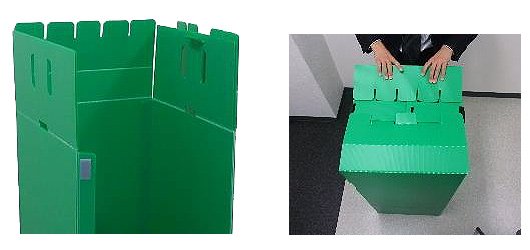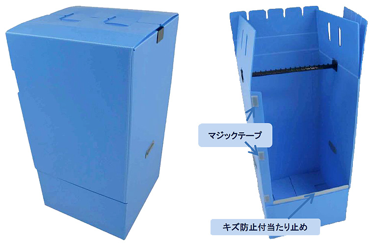 | 引っ越し用収納ケース ※ハンガーバーはオプションです。 ![]() ■特長 ●軽量で丈夫 軽くて作業性がよく、耐衝撃性に強い、繰返し使用可能な製品です。 ●コストが安い フラップを差込式にして、最小限度にマジックテープを減らしています。 ![]() ●上部・底部を差込式に 軽くて作業性がよく、耐衝撃性に強い。 ●扱い易い 横開きでドアーをサイドに固定できる設計で、収納と取出しが簡単です。また、簡単な折畳み構造で、組立、折畳みが容易に出来ます。 ![]() ●環境にやさしい 環境への影響とCO2 の排出を抑える為に、再利用回収が可能な ポリプロピレン樹脂です。 ■組み立て方 ①上部の蓋は差し込むだけ ![]() ②底部の組み立ても差し込むだけ ![]() ③開きドアを簡単に差し込んで固定します。 ![]() ■仕様
