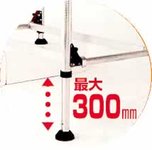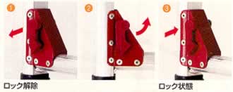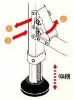 ■段差がある場所に設置する場合 本器は、平地以外の場所にも設置できます。 あらゆる作業に合わせてお使い下さい。 ![]() ![]() ■伸縮操作レバーダブルロック機構 ![]() ![]() ①伸縮操作レバーの①部を手前に引き、伸縮操作レバーのロックを解除します。 ②伸縮操作レバーの②部を矢印方向に回転させながら、スライド支柱の長さを調整します。 ③4箇所の伸縮操作レバー①部を押し込み、ロックします。 ■作業床寸法 ![]() ■わく寸法 ![]() ■仕様