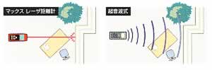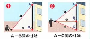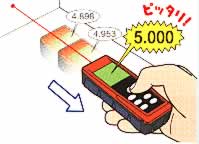 ■面積・容積 計算機能 面積・容積を自動計算 ![]() ■ピッチ測定機能 位置決めしたい長さを設定し、本体をゆっくり移動させると、本体をゆっくり移動させると、設定した長さ付近で「ピ・ ピ・ピ・・・」と音が鳴りポイントを知らせてくれます。(±100mmで音が鳴り始め±1mmで音色が変わります。) ![]() ■簡易ピタゴラス機能 離れた場所からA-B間、またはA-C間の距離をピタゴラス機能で測定できます。 ※オフセット機能はありません。※三脚には取り付けられません。 ![]() ■レーザだから安心測定 レーザ方式では、目標をピンポイントで捉えるので、段差や周辺環境による誤差測定がありません。 超音波は放射状に拡散しますので、段差や凸凹などに影響を受けやくなります。 ![]() ■機能一覧(比較表)