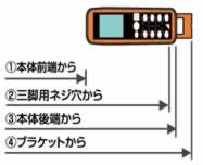 まります。測定誤差は、明るい日光の下、反射が弱いターゲットや粗い面の測定などの悪条件下で発生します。 30mを超える距離で、ターゲットプレートを使用しない場合は、測定誤差が±10mmまで増加する場合があります。 ※2 ピタゴラス機能や関数機能で求めた長さは、測定値に基づく計算結果であり、本機の測定精度の対象外です。 測定誤差は、測定距離、測定条件、測定方法により異なります。 ※3 機器が防塵型で、あらゆる方向からの飛沫に耐えられることを示します。 ※4 測定条件、使用方法で異なります。 ■オプション 日中屋外などでの測定作業で長距離を測定する際や、反射条件の悪い測定対象に使用。