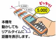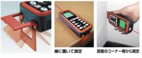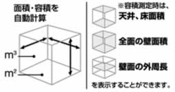 ■測定基準![]() ■ブラケット機能 ![]() ■バックライト ![]() ■メモリー機能 ●最大20件保存できます。 ■計算機能 ●加算、減算できます。 ■タイマー機能 測定時の手ぶれを防ぎます。 ※三脚や一脚を用いて手の届かない場所を起点にした測定ができます。 ■連続測定が可能 ![]() ■最大・最小の距離を測定 ![]() ■面積・容積・計算機能 ![]() ■ピッチ測定機能 測定ポイントを音でお知らせ。 床工事や照明工事等で、一定間隔を連続して測定する時に便利です。 位置を決めたい長さを設定し、本体をゆっくり移動させると、設定した長さ付近で「ピ・ピ・ピ・・」と音が鳴りポイント を知らせてくれます。(±100mmで音が鳴りはじめ±1mmで音色が変わります) ![]()