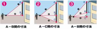 ■簡易ピタゴラス機能 離れた場所からA-B間、またはA-C間の距離をピタゴラス機能で測定できます。※オフセット機能はありません。 ![]() ■三角形関数機能 三角形の3辺を測定すると、@とAの内角が計算できます。 ![]() ■仕様