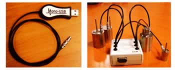 | <ロガー用インターフェース> ●全てのロガーに対応するデータ通信アダプター ●シングルインターフェース(USB)はデータロガー1個に対応 ●マルチロガーインターフェースは最大6個のロガーと接続することができます。(USB対応) ●使用例 マルチロガーインターフェースをPCに接続した状態 ![]() ■タイプ
