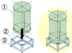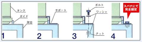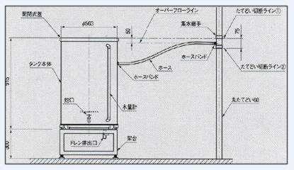 ■取り付け方法 1.タンクを架台にのせた状態でタンク上面を同じ高さの位置の雨どいを付属の、のこぎりを使って切断し(切断ライン1)その位置から75mm下の雨どいを切断します。(切断ライン2) 2.切断してきり去った部分の端面を処理し、集水継手をはめます。 3.集水継手とタンクをホースで連結し、ホースバンドで止めます。 ![]() ■タンク設置方法 タンク底面の中心が架台上面の中心になるように置きます。 ![]() ■タンク固定方法 1.タンク底面の中心が架台上面の中心になるように置きます。 2.上図のように固定用サポートを置きます。 3.上図のようにサポートの穴と架台上面の穴にワッシャを間に入れてボルトを通します。 4.上図のように通したボルトに下からさらにワッシャを間に入れてナットをネジ込みます ![]() ■警告 ●貯留タンクの水は飲めません。絶対に飲まないでください。 ●貯留タンクの上に乗ったり、ぶら下がったりしないでください。 転倒して重大事故につながる危険性があります。転倒防止として、鎖等を本体に取付け、住宅外壁等に固定してください。 ●200リットルタイプ以外は、蓋の上にものを置かないでください。落下して重大事故につながる危険性があります。 ●台風等の強風発生の恐れがある時は、強風による転倒防止対策として貯留タンクの中に半分以上水を入れてください。 ●貯留タンクはポリエチレン製ですので火気を近づけたりしないでください。 ●雨水貯留以外の目的には使用できません。 ●集水継手・貯留タンク内部は、定期的に点検・清掃を行ってください。 |