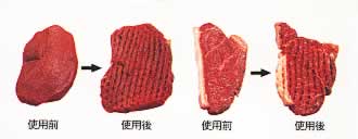 | ■特長 ●ステーキ・焼肉・カツ・バーベキュー・カレーシチュー肉などの筋や皮を切り、肉を柔らかくします。 ●等級の低い肉や、本来硬い部分の肉をより有効に用いられます。 ●機械の操作が簡単で、扱い易い。 ●分解掃除もラクにおこなえ、衛生的です。 ●肉を柔らかく大きくします。 ■内蔵刃 ![]() ■使用時 ![]() ■仕様