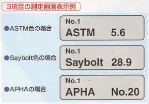 いつでも・どこでも簡単に石油製品の”色”測定。 <特長> セーボルト色・ASTM色・APHA(ハーゼンNo)3項目の簡易測定がi台で行えます。 軽量でしかもDC/AC両用:持ち運び自由自在。場所を選ばず簡単に測定。 プリンター標準装備:記録が簡単。 データメモリ機能あり。パソコンへのデータ転送可能。(RS-232C標準装備) 見やすい大きな画面・日本語/英語表示切り替え可能。 |