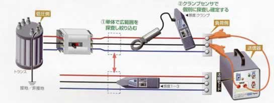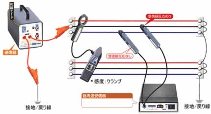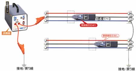 | ■特徴 @あらゆる回路に対応 死線・活線(AC/DC 0〜240V)回路の目的とする配線を確実に探査できます。 A作業効率UP! 非接触方式の受信機で大まかに探査し、確定はクランプセンサで電線を挟んで探査できるので、作業性が良く、確実 に探査できます。 B信頼性UP! オプションの低周波受信機(M338WC-A-R1)を使用すれば、誘導等の影響が懸念される現場での探査信頼が飛躍 的に向上します。(死線探査) ■死線探査方法 ●配線探査 @非接触受信器にて電線束を探査する。 ※非接触で電線をトレースし、受信器が反応する電線束を絞り込む。 ![]() A大まかな電線束が確認できたら、クランプセンサで個別にクランプして目的の電線を確定する。 低周波受信器:誘導等の影響で、非接触受信器では確定が困難な場合。 ![]() ■活線探査方法 ●ブレーカー探査等 ![]() ●IV線/CV・CVT等ケーブルの探査(AC/DC) ![]() ※非設置回路の場合はコンデンサ等で設置することにより探査が可能です。 ●他の配線利用による探査方法 低周波受信器は活線回路には使用できませんが、下図のような形で探査線と信号戻り線の間に電圧がかからない 同電位配線の場合は使用できます。 ![]() ※探査回路に漏電ブレーカーがある場合は漏電ブレーカーが動作する恐れがあります。 ※低周波受信器は探査線には負荷が接続されていても探査できますが、 負荷電流が1A以上流れている場合には探査できません。 ■配線・ケーブル特定のための選択基準