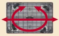 ■クイックターン方式![]() ●回転半径が従来の四輪車とくらべて1/2以下で回ります。 その場で方向転換がすばやくできるクイックターン方式。五輪仕様のキャスターより、旋回スペースが実に小さくこまわりがきき、狭いところでもスムーズに方向転換ができます。 |