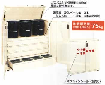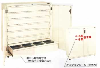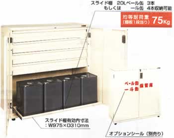 スチールタイプの一斗缶保管庫引き出し付き。 | 引き出し付一斗缶保管庫 品番 M350U-ITKBD4S 廃番 |