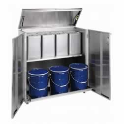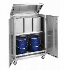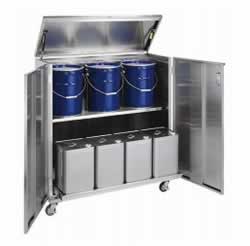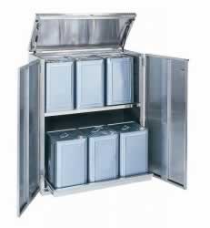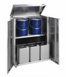 一斗缶・ペール缶を保管するのに最適で、本体は耐薬品性に優れたSUS304採用しています。 化学物質排出管理促進法(PRTR法)に基づく有害性のある化学物質を安全に取り扱って頂ける商品です。 上段の一斗缶は、ガスバネで天蓋を上げることにより、又、下段の一斗缶は、棚がスライドして前へ出て来ることにより、出し入れがスムーズにできます。 |