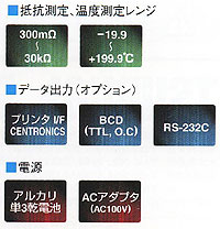 ●電池とACアダプタの2電源方式 ●リード線抵抗に影響されない直流4端子法を採用 ●温度測定可能、温度換算・温度補正機能付き ●本体1kgの軽量、持ち運びハンドル付 ●プリンタI/F、BCD、RS-232Cデータ出力付を用意 |
