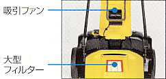 | ■特長 1.空気がキレイ コンテナに掃き込まれた細かな塵・埃は、吸引ファンによって大型フィルターに取り込まれるので、汚れた空気を撒き 散らしません。 ![]() 2.簡単操作 ブラシの作動はバッテリー式でハンドルを軽く押して歩くだけなので作業者に負担がかかりません。シングルダイヤル で作業モードの選択ができ、初めての方でも迷うことなく楽に扱えます。 ![]() 3.電動可動ブラシ 電動で駆動するメインブラシにより、ムラのない効率の良い作業が可能です。 4.高い作業性 手押しタイプでコンパクトなのに、700mmのワイドな清掃幅とコンテナは30リットルの回収量を誇り作業効率を高めま す。また、サイドブラシを跳ね上げてメインブラシだけで清掃も可能です。 メインブラシとサイドブラシは床面に合わせて接触圧力を調整することができ、効率良くゴミを回収できます。 自立するコンテナで回収したゴミの分別も簡単に行えます。 ![]() 5.収納性 使用しない時にはハンドルを本体側に折り曲げ、収納に場所を取りません。 ![]() ■掃き込み方式採用 メインブラシが路面のゴミを、本体ダストコンテナに掃き込みます。 ![]() ■ハンドル ハンドルは高さを3段階に調節でき、作業者の背丈に合わせられます。 ![]() ■使用例 ![]() ■仕様