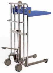 | ■特長 ●最低位95mmを実現し、ボックスパレットの運搬作業にも便利 ●操作は簡単な油圧ペダル。 ●自動積荷チェックバルブ内蔵。 ●早揚り機構 無負荷(軽負荷)時はテーブルの上昇スピードが2~3倍になり、作業効率がアップ。一定の荷重を超えると、通常スピードに自動切替になる安全設計です。 ※200kgタイプはオプション、400kgタイプは標準装備 ![]() ●双輪キャスター 走行・旋回を同時に止めるストッパーを装備。車輪はエラストマーゴムを採用し、床をキズつけないクリーンでやさしい 材質です。 ![]() ●ゴム車輪 M37C2-**SLAタイプはハードな作業環境に適したゴム車輪を採用。 ![]()