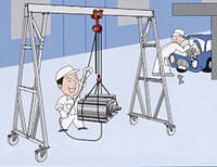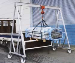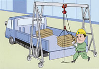 クレーン設備のない作業現場での重量物の揚げ下ろしに最適 クレーン設備のない場所で活躍する移動式の門形クレーン。 |