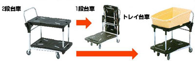 1台で(1段台車、2段台車、トレイ台車)の3つの使い分けができる運搬用マルチ台車。 | トリプルカート運搬車 品番 M385TW-95RRMシリーズ 価格は下記を参照下さい |