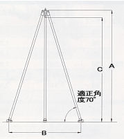 注意)開脚適正幅は、三脚の開脚時において地面から適正な脚の角度70度に制限した時の脚の開き幅を示した