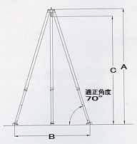 注意)開脚適正幅は、三脚の開脚時において地面から適正な脚の角度70度に制限した時の脚の開き幅を示したものです。(使用する場合には必ずこの角度をお守りください)