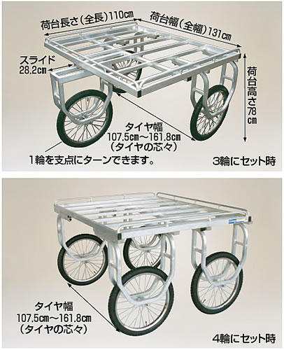 ■使用例![]() ■仕様 ●荷台幅(全幅):131cm ●荷台長さ(全長):110cm ●荷台高さ:78cm ●タイヤ幅:107.5cm〜161.8cm(タイヤ芯々) ●積載重量:100kg ●重量:18.5kg ■寸法図 ![]() |