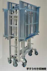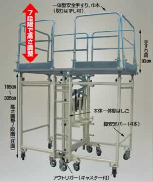 | ■特長 ●広い床面積(1台約3m2) ●高さ調整7段階(20cmピッチ) ●リースコストの大幅削減 ●使い易いワンタッチ構造 ●高い安全性と抜群の耐久性 ●時間、労力の短縮 ![]() ![]() ■仕様